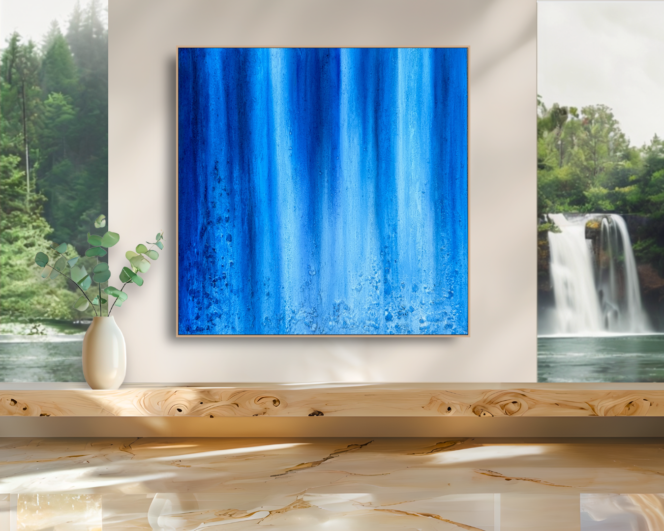 Composed with sand and stones gathered from the plunge pool of an Icelandic waterfall, layered with eco-oil paints on a gallery-wrapped canvas. Each element carries the essence of movement and cleansing, reflecting water’s rhythm of renewal—and bringing its soothing clarity into your space.