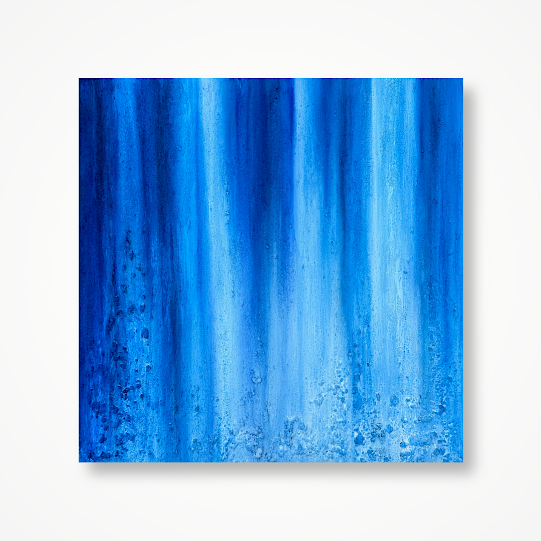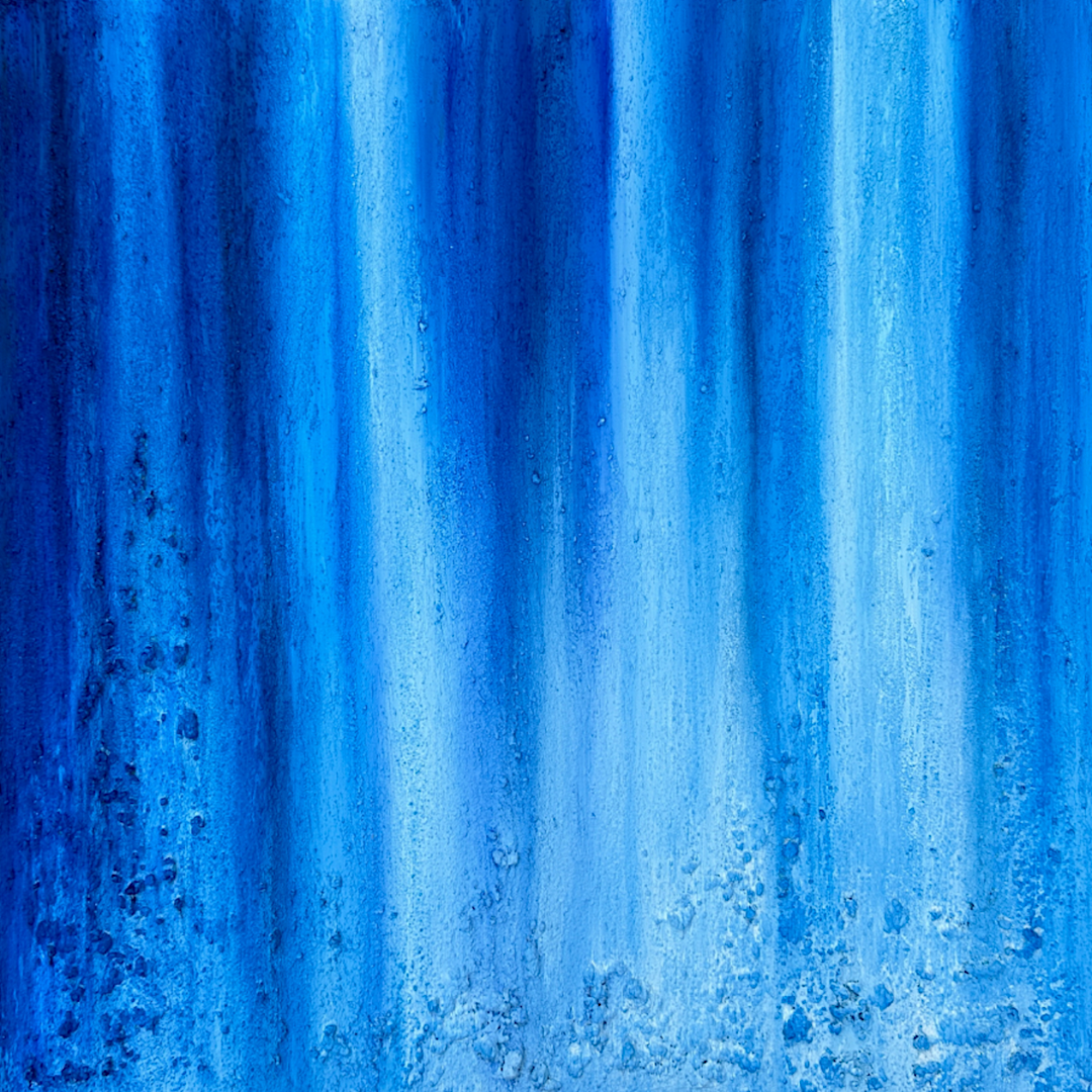 Infused with sand and stones gathered from the plunge pool of an Icelandic fall, Cascading Waterfall echoes the soundwave patterns of falling water. Cool blues, whites, and indigos capture the feeling of movement and cleansing—a visual echo of nature’s song of purification and flow.