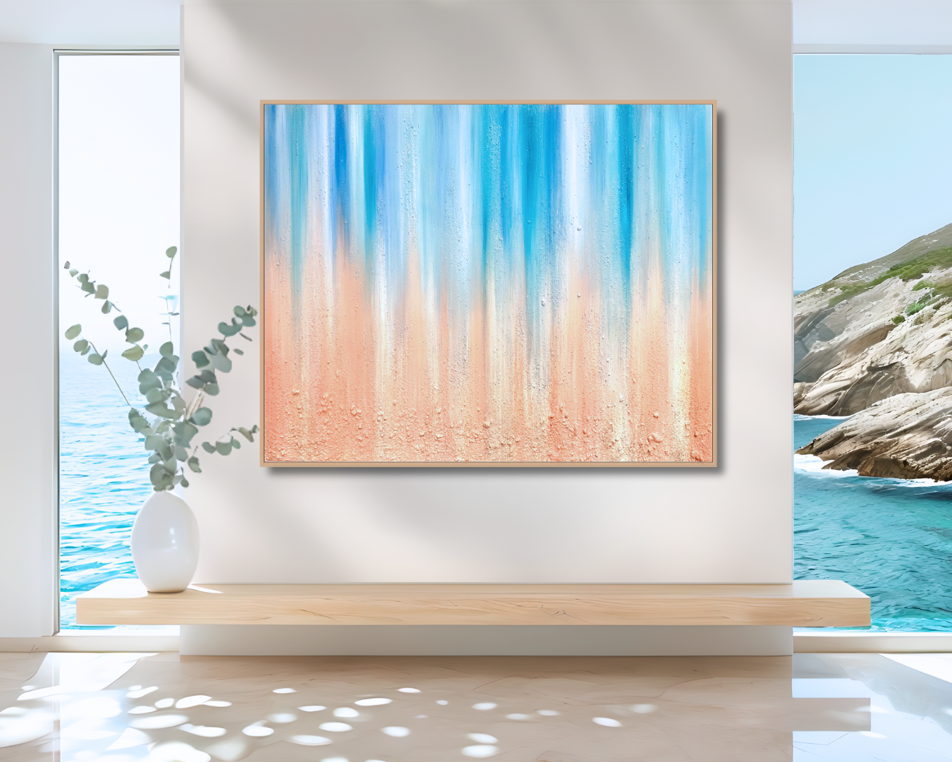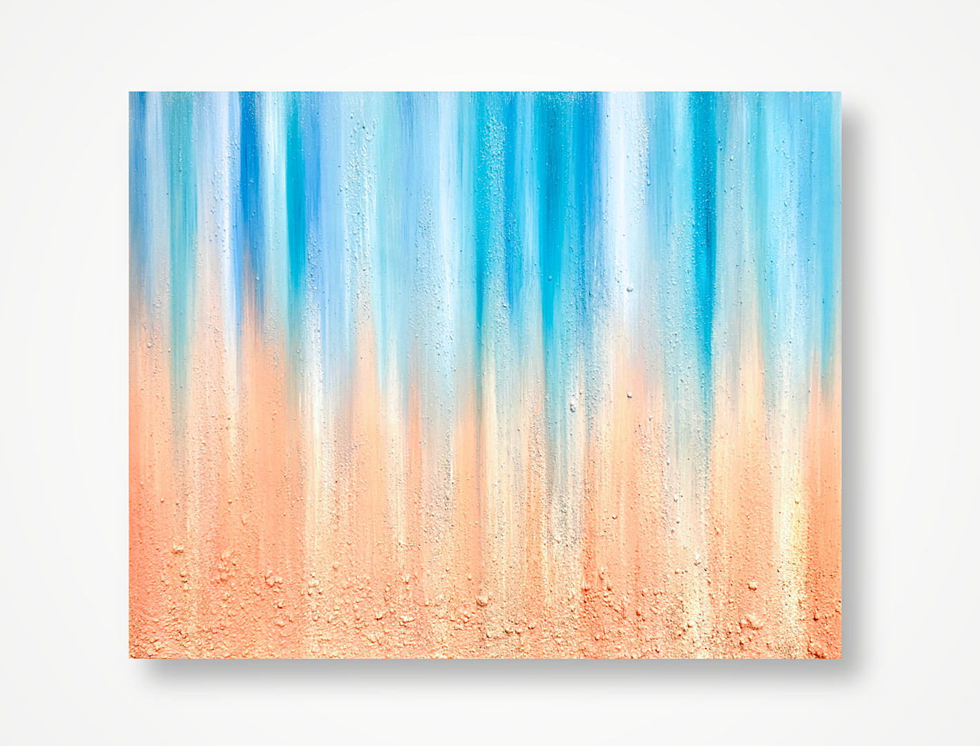 Composed with sand and stones gathered from the beaches of Tahiti, Cozumel, and the Virgin Islands, layered with eco-oil paints on a gallery-wrapped canvas. Each element embodies the essence of water and rhythm, reflecting the ocean’s eternal dance—and bringing renewal and calm into your space.