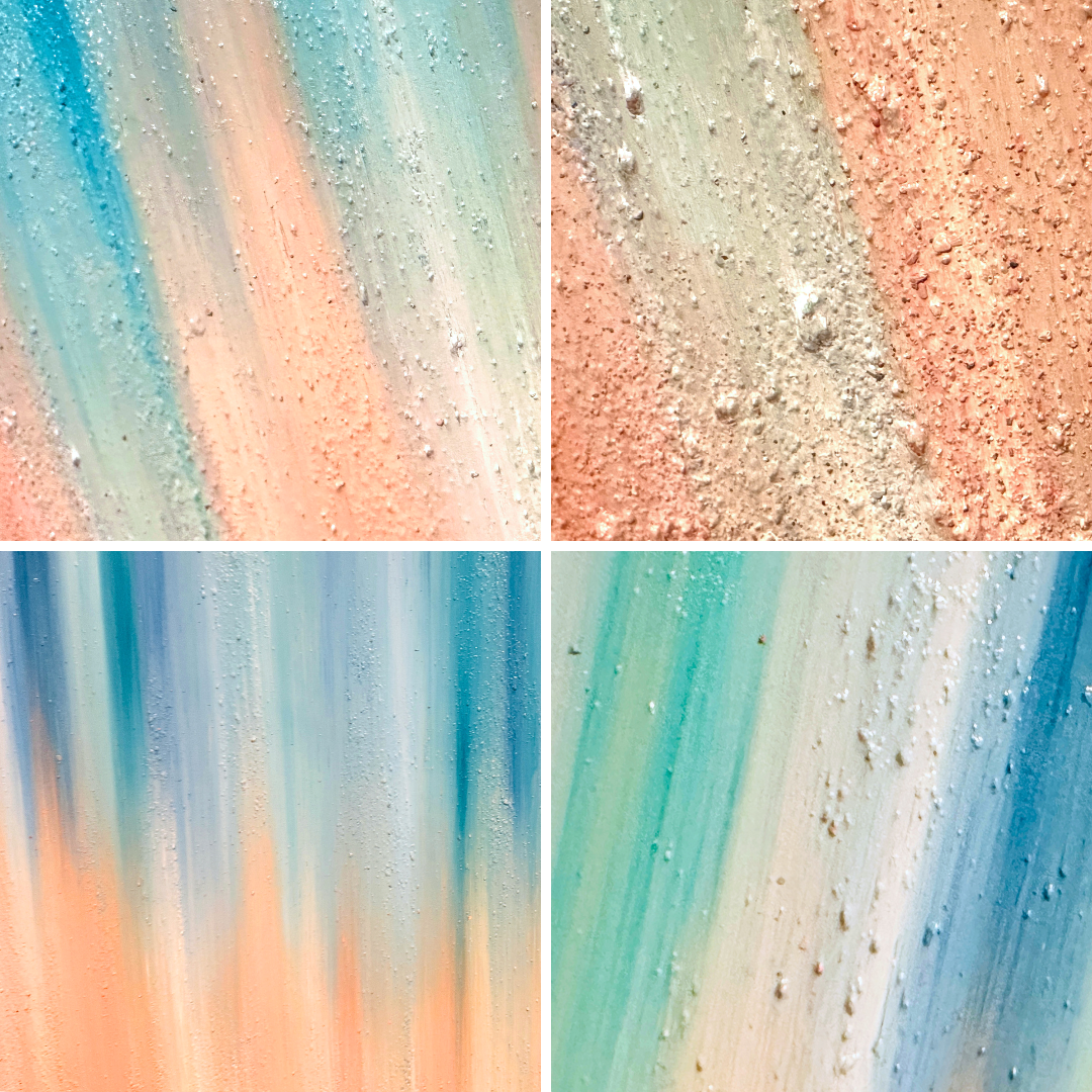 Infused with sand and stones gathered from the beaches of Tahiti, Cozumel, and the Virgin Islands, Ocean Tides mirrors the soundwave patterns of the sea’s rhythmic breath. Layers of invigorating teal and soft peach evoke the harmony of water and shore—an elemental reminder that renewal lives in every ebb and flow.